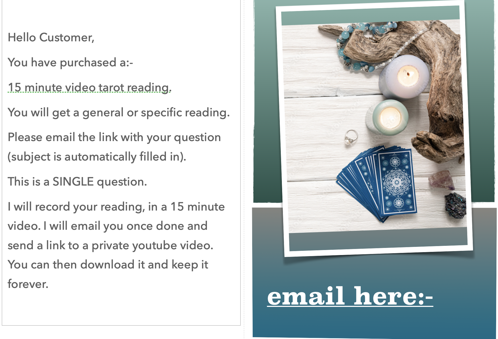 You will get a general or specific reading.Please email the link with your question (subject is automatically filled in). This is a SINGLE question.I will record your reading, in a 15 minute video.